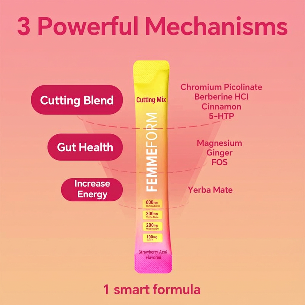 FEMMEFORM CUT is a daily cutting drink mix designed to support appetite control and digestion so your cut feels easier to maintain.